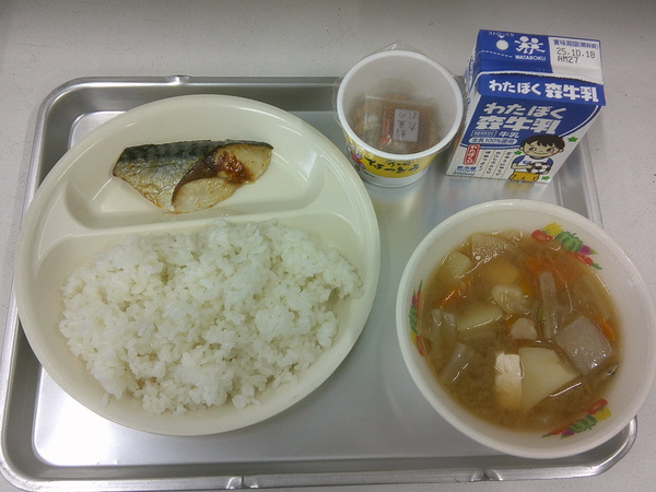 10月2日(木)は第1回目として、いわむらかずおさんの『14ひきのあさごはん』から、食パンといちごのジャム、きのこのシチュー。10月9日(木)は第2回目として、松本春野さんの『まほうのおまめ だいずのたび』からで、納豆と豆腐のみそ汁が給食に登場しました。