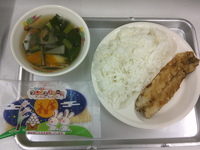 今が旬の、「さんまのかばやき」に「白飯」。そして、月見団子の入った「月見団子汁」と「お月見デザート」。月見団子汁には、星形のラッキー人参、ラッキー大根の他に、ウサギのイラスト入りのかまぼこも入っていて、子どもたちもとても喜んでいました。