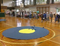 2・3時間目に体育館で、4年生の子どもたちとさくら草特別支援学校の子どもたちとで交流会を行いました。体育館に集まり、ヨーロッパ発祥のスポーツ「ボッチャ」をアレンジしたゲームで一緒に楽しみました。