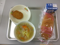 また、5回目のおはなし給食のメニューは、竹下文子さんの絵本『ポテトむらのコロッケまつり』から、ポテトコロッケです。お昼の放送では、お話の最初の部分を、図書委員さんが読み聞かせしてくれました。たくさんのジャガイモを使ったコロッケは、給食室で一つ一つ丁寧に揚げたもので、ほくほく甘くて、とても美味しかったです。