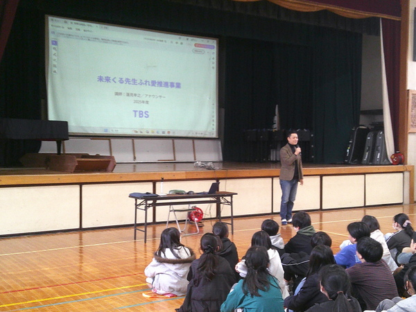 未来(みら)くる先生 ふれ愛推進事業としてTBSアナウンサーの蓮見孝之アナウンサーをお呼びし、6年生に向けて、アナウンサーの仕事や話し方・伝え方講座をしていただきました。