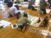 1・2年生は教室でフェルトペンを使って、3~6年生は体育館で筆を使って。