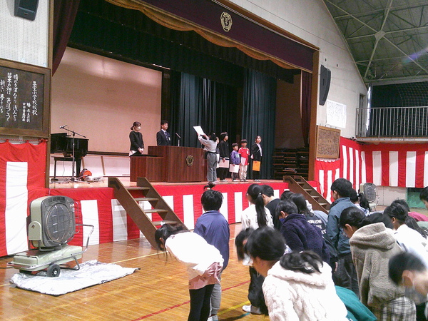 体育館に集まった子どもたちは、この一年をやり遂げた達成感とともに、次の学年への期待を胸に、式に臨んでいました。各学年の代表が、校長先生から修了証をいただきました。